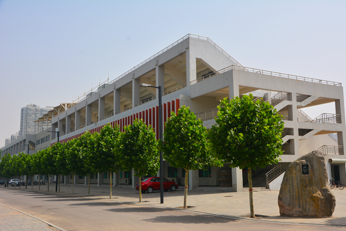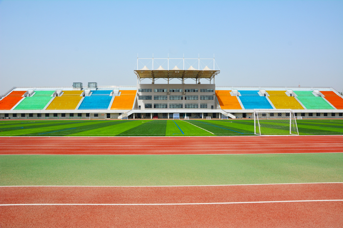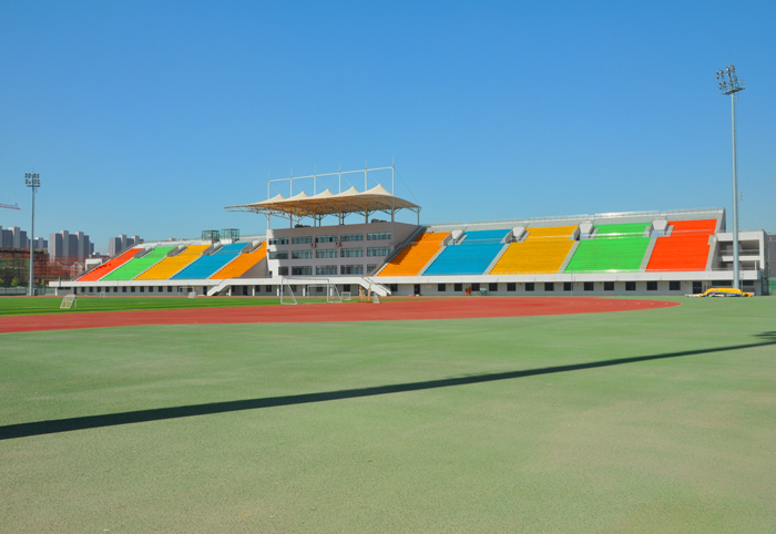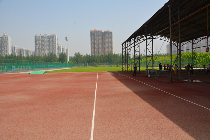 御风运动场,御风运动场是2014年承担河北省第十八届大学生运动会田径比赛所有项目,装备四塔式配套灯具,不仅能够满足白天比赛需求,也能保证夜间赛事的顺利进行。看台整体为框架结构,基底面积1432.84平方米。看台位于运动场地西侧,中间主席台部分宽度36米,设计座位数192个,主席台两侧南北两个看台区设计座位数各为3130个,总座位数6452个,一层设有塑胶百米跑廊。