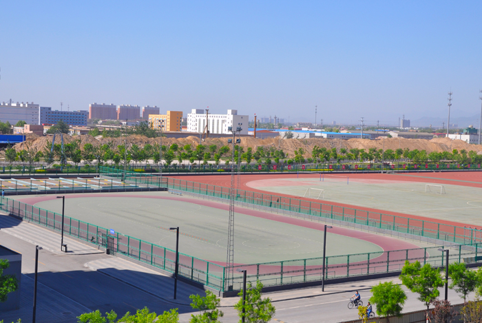 场地内设两个标准足球场,一块地面为人造草坪,另一块则是塑胶地