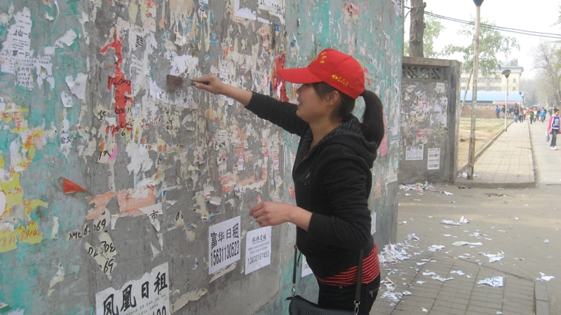 活动中申搏志愿者用水桶、刷子、铲子等工具,对学校中院甬道两旁的商业小广告进行了集中清理。在清理过程中,同学们不怕脏和累,凭着自己的耐心和坚持,小心翼翼的把广告残留物清理,将宿舍、食堂、教学楼墙壁上及张贴栏旁边的“牛皮癣”刮干洗净。经过一番辛苦劳动,校容校貌得到了有效改善。